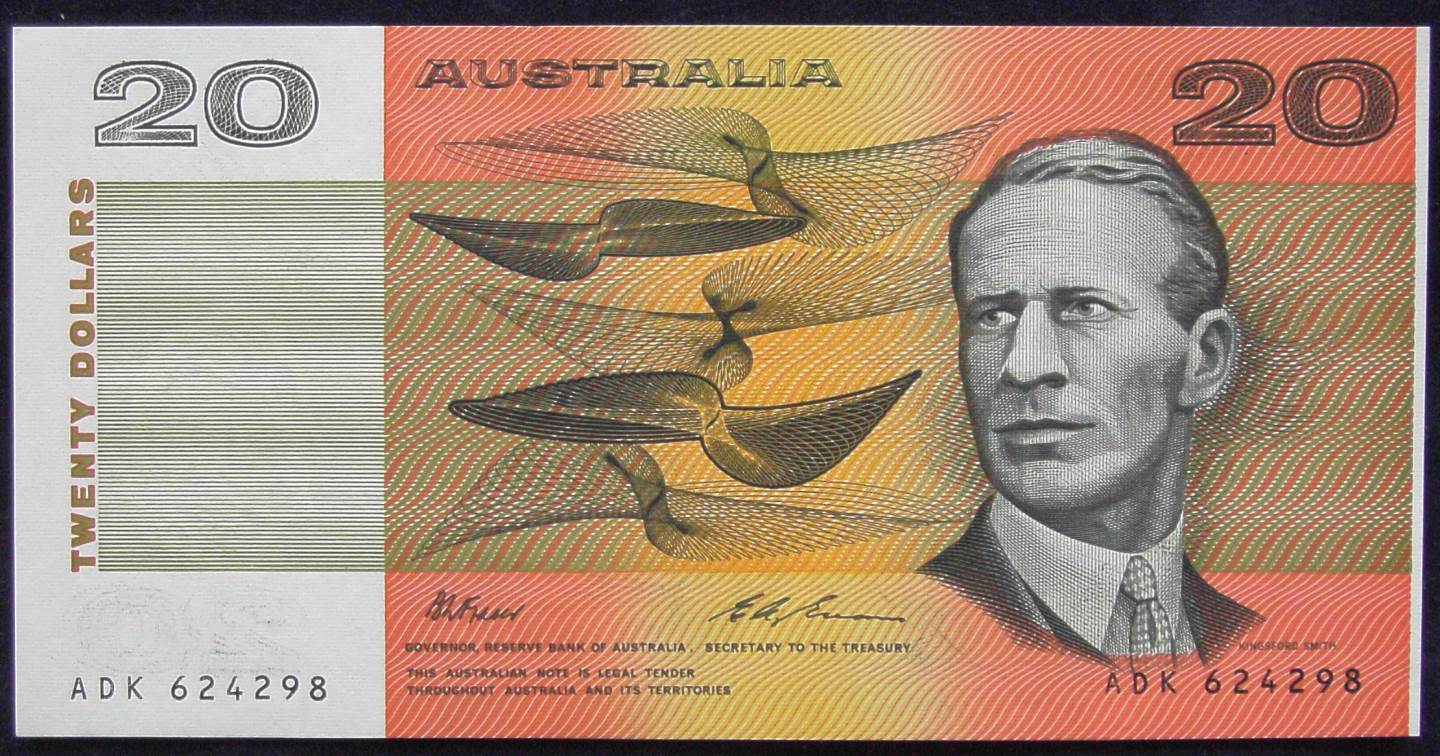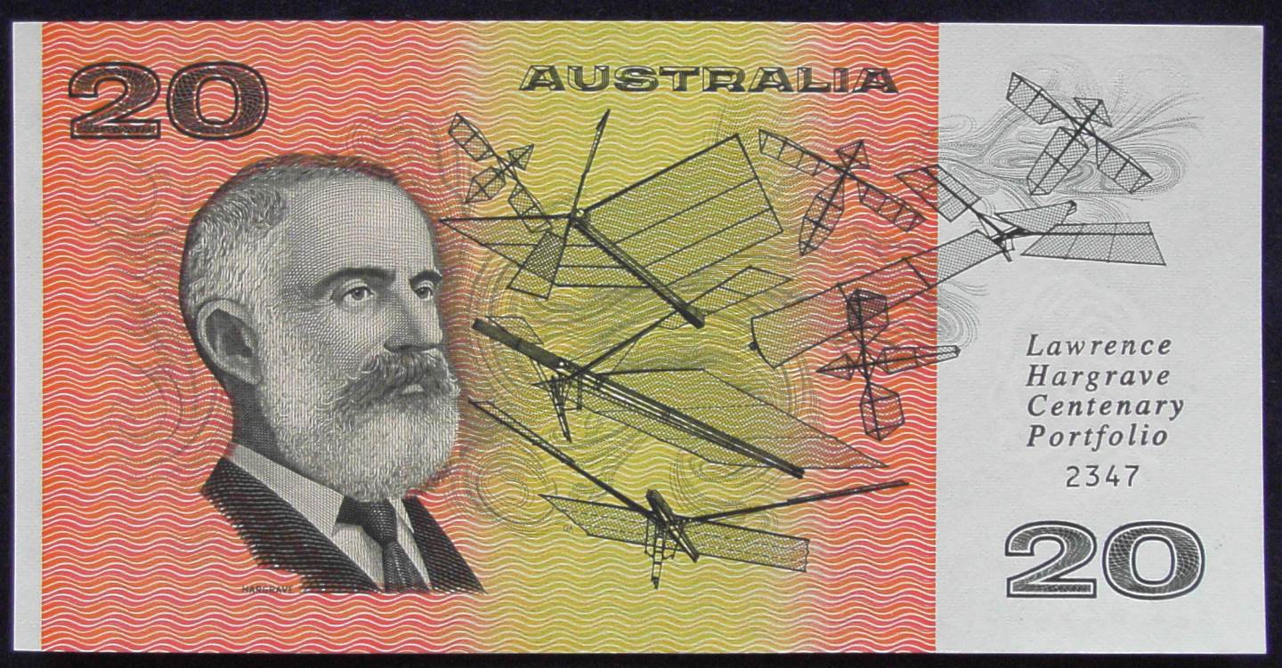 The note offered here is even rarer as it includes a Limited Edition No.2347 of of less than 4,000 Printed in Black OvPT. It celebrates the 100th Anniversary 1893-1993 of Hargraves famous box kite experiment, an innovations in Aviation at Stanwell Park South of Sydney in 1893. Nicely exhalting the aviation theme of the old $20 Australian paper banknote it has Sir Charles Kingsford Smith, the early Australian aviator on the reverse of this very last side-thread & OCRB machine readable serial font type $20 banknote.