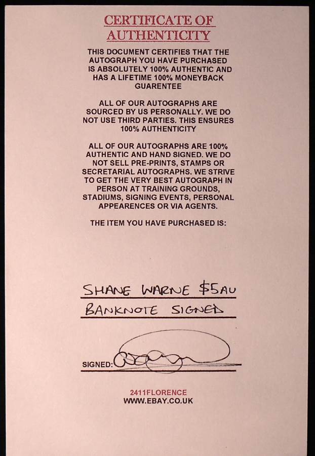Signed by Shane Warne (The King Of Spin) when he was playing at Hampshire Count Cricket Club in the U.K.