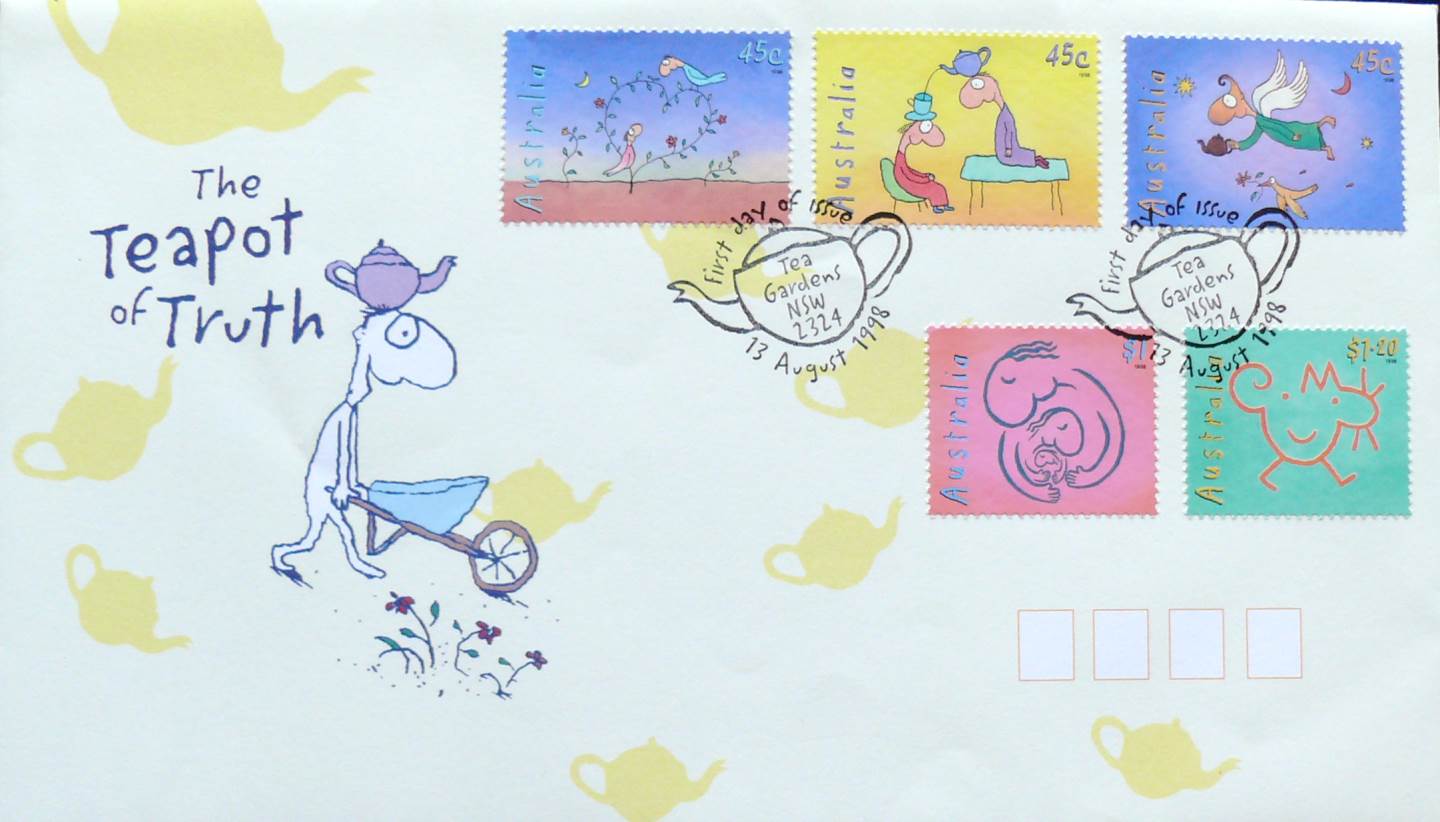 Teapot of Truth – Michael Leunig – First Day Cover – 1998 – Tea Gardens N.S.W general release.