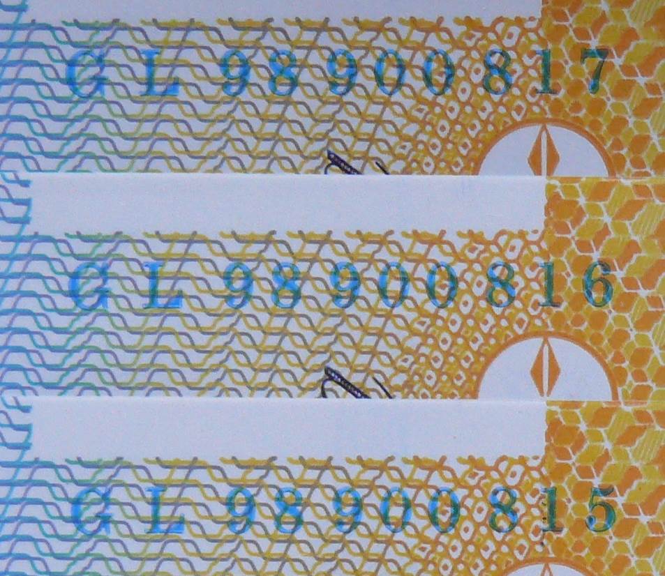 8. The serial number of each note is printed twice in blue on the back of the note. A different font is used for each serial number. The alpha prefix of two letters is followed by two numerals representing the year of the production, followed by a further six numerals. Under ultra-violet light, these serial numbers fluoresce.