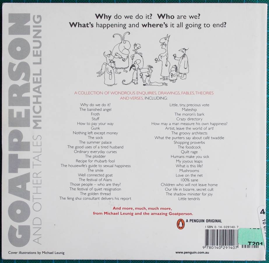 If your looking for Australian wit and humour, a pictorial adventure, cariactures and cartoons to warm your life then here they are. Why do we do it? Who are we? What’s happening and where’s it all going to end? A collection of challenging enquiries, cartoons, fables, theories and verses which include, "Why do we do it?"; The Banished Angel; Gunk; The good uses of a tired husband; The Groovy Architects; The housewife’s guide to sexual happiness; The Festival of Alans; The Moron’s Bark; Crazy Directory; Quilt Rage;