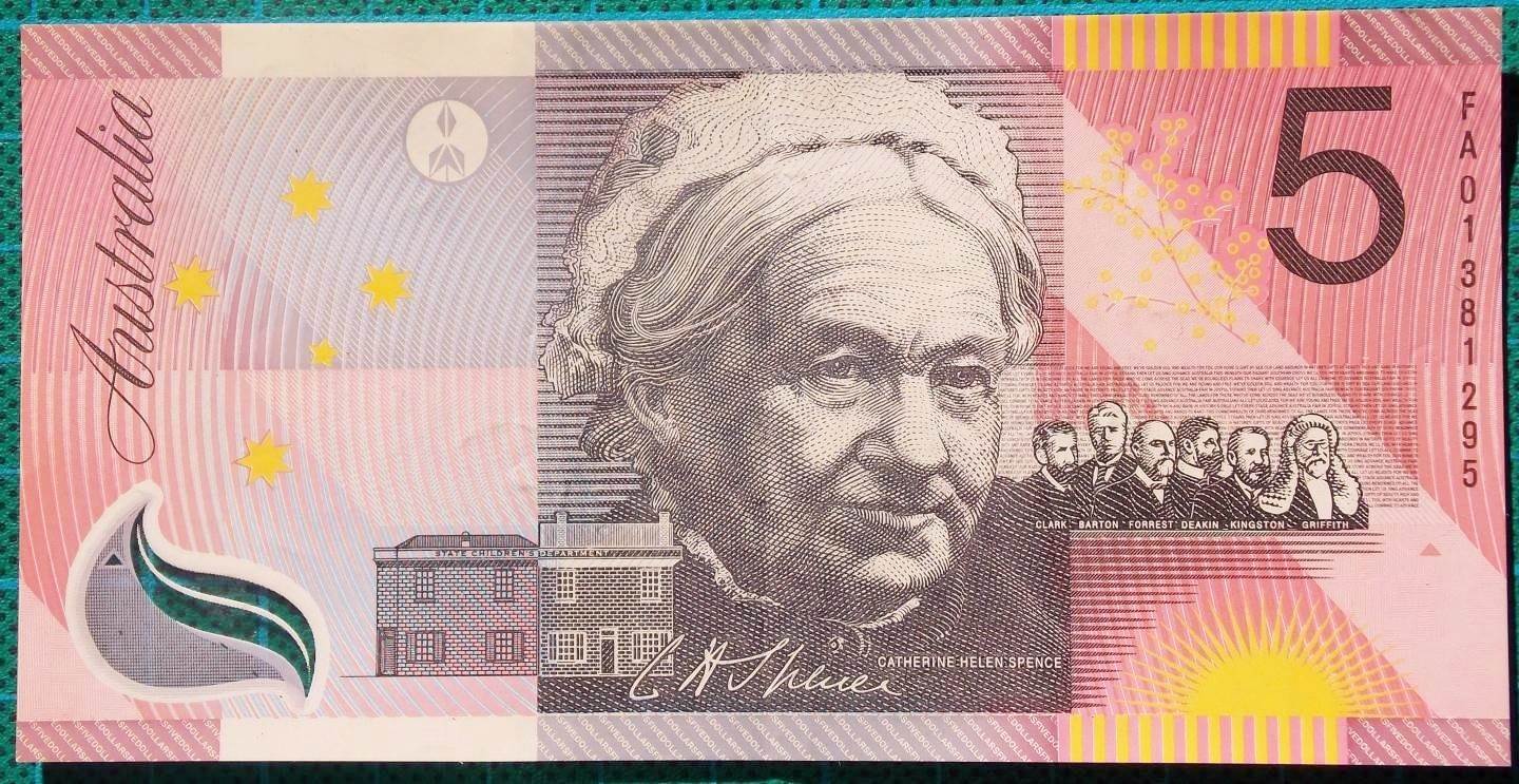 Reverse: Catherine Helen Spence (31 October 1825 – 3 April 1910) was an Australian author, teacher, journalist, politician and leading suffragette. In 1897 she became Australia’s first female political candidate after standing (unsuccessfully) for the Federal Convention held in Adelaide. Known as the “Greatest Australian Woman” and given the epitaph “Grand Old Woman of Australasia”, Spence is commemorated on the Australian 5 dollar note issued for the Centenary of Federation of Australia. Spence was born in Melrose, Scotland, as the fifth child in a family of eight. In 1839, following sudden financial difficulties, the family emigrated to South Australia, arriving in November 1839 at a time when the colony had experienced several years of drought and the contrast to her native Scotland made her “inclined to go and cut my throat”. Nevertheless, the family endured seven months “encampment” growing wheat on an eighty acre (32 ha) selection before moving to Adelaide.