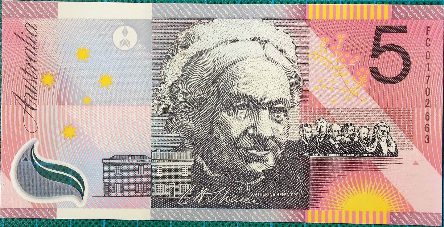 Reverse: Catherine Helen Spence (31 October 1825 – 3 April 1910) was an Australian author, teacher, journalist, politician and leading suffragette. In 1897 she became Australia’s first female political candidate after standing (unsuccessfully) for the Federal Convention held in Adelaide. Known as the “Greatest Australian Woman” and given the epitaph “Grand Old Woman of Australasia”, Spence is commemorated on the Australian 5 dollar note issued for the Centenary of Federation of Australia. Spence was born in Melrose, Scotland, as the fifth child in a family of eight. In 1839, following sudden financial difficulties, the family emigrated to South Australia, arriving in November 1839 at a time when the colony had experienced several years of drought and the contrast to her native Scotland made her “inclined to go and cut my throat”. Nevertheless, the family endured seven months “encampment” growing wheat on an eighty acre (32 ha) selection before moving to Adelaide.