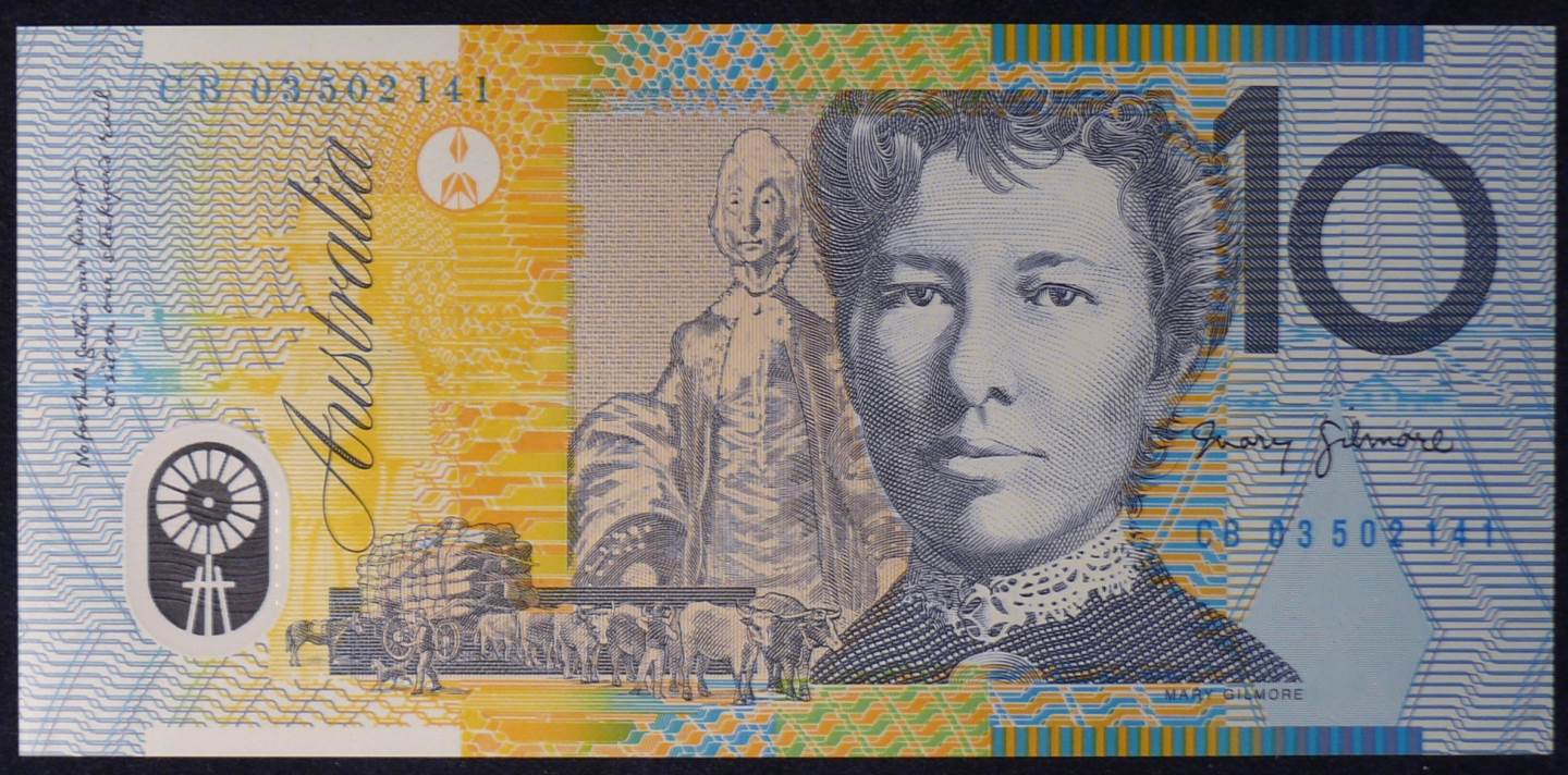 4. Slightly raised printing (intaglio) can be felt with your fingers, this is used on selected parts of the design such as the portraits of Dame Mary Gilmore and Banjo Paterson, the word Australia and the numeral 10.