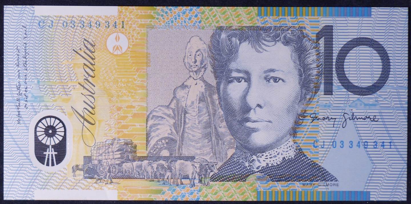 4. Slightly raised printing (intaglio) can be felt with your fingers, this is used on selected parts of the design such as the portraits of Dame Mary Gilmore and Banjo Paterson, the word Australia and the numeral 10.