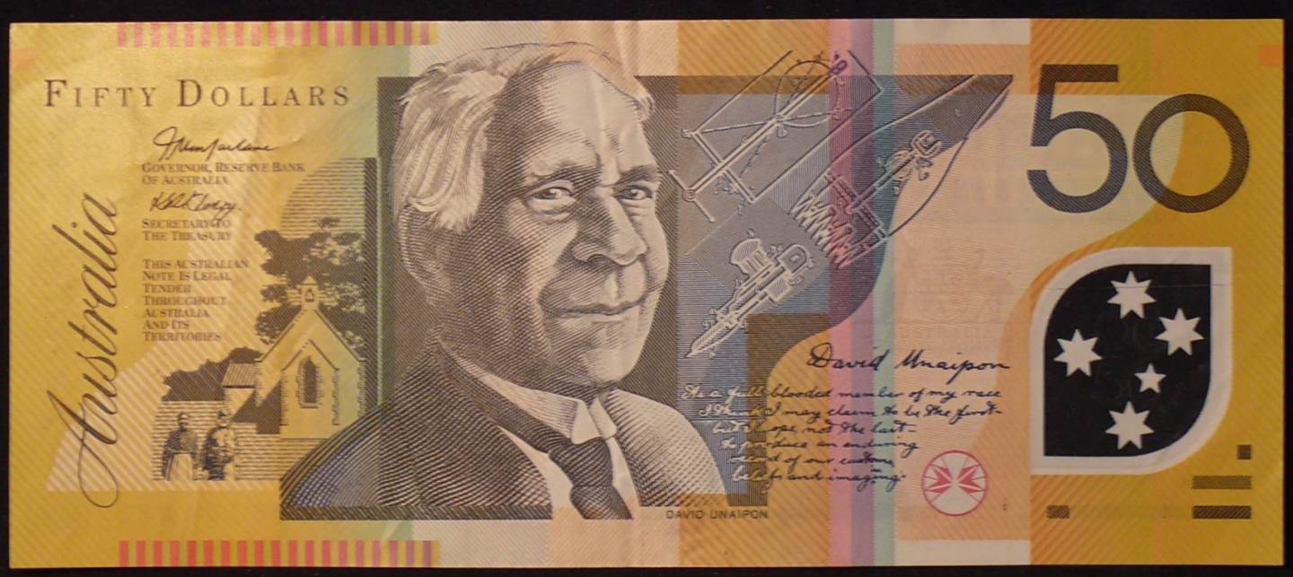 David Unaipon (28 September 1872, Point Mcleay (Raukkan) Mission – 7 February 1967) was an Australian Aboriginal of the Ngarrindjeri people, a preacher, inventor and writer. Today, he is featured on the Australian $50 note in commemoration. David Unaipon was awarded ten patents, including a shearing machine, but did not have enough money to get his inventions developed. He was also known as the Australian Leonardo da Vinci for his mechanical ideas, which included anticipatory drawings for a helicopter design based on the principle of a boomerang and his research into harnessing the secret of perpetual motion.