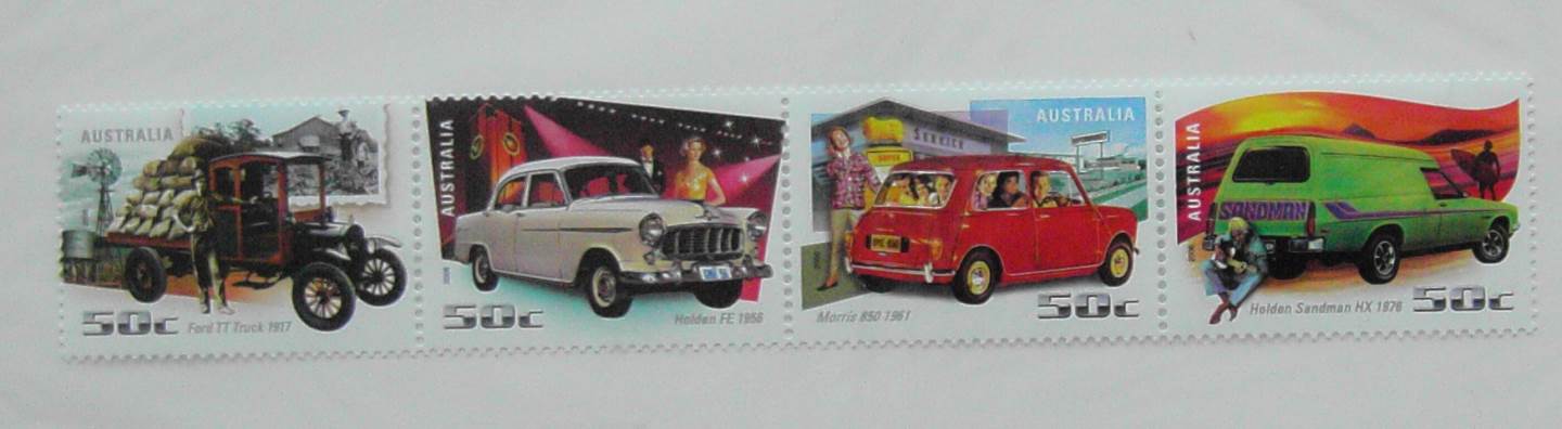 Australia Post postage stamps strip from 2006 featuring Australian cars.