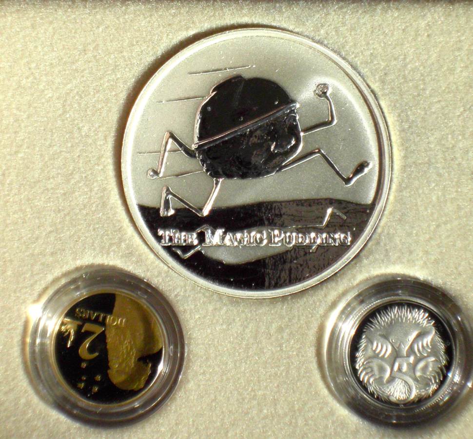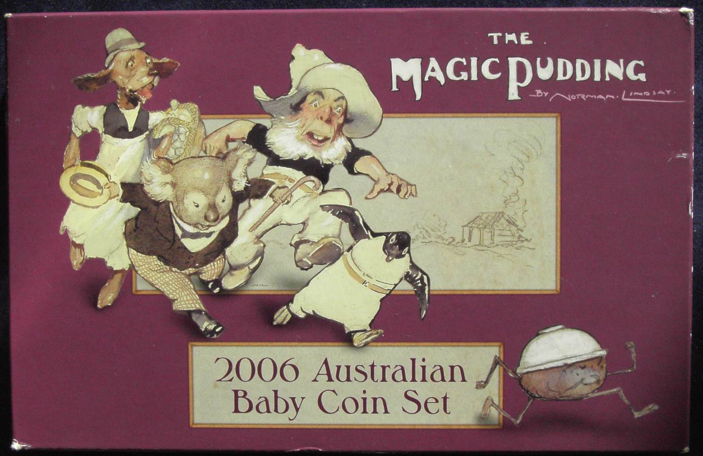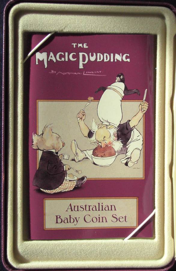 The 2006 Baby Proof collection presents all six circulating coin designs from 5c through to $2. Also included is a Magic Pudding sterling silver medallion that can be inscribed with the new baby’s name. The Magic Pudding is an  Australian children’s book written and illustrated by Norman Lindsay in 1918. It is a comic fantasy, and a classic of Australian children’s literature. Bunyip, a koala, runs away from home because he can’t stand his Uncle’s whiskers, and meets a sailor and a penguin who own a magic pudding. The puddin’ is an irritable fellow, always insulting them, and is contemptuous of how little they eat of it. Then pudding can magically replenish itself and can also change flavour to any pie or pudding. There are also two dangerous puddin’ thieves lurking about who use a multitude of disguises. Despite the watchfulness of Bill Barnacle and Sam Sawnoff, the puddin’ is always being stolen. The cut and come again pudding is herein commemorated.