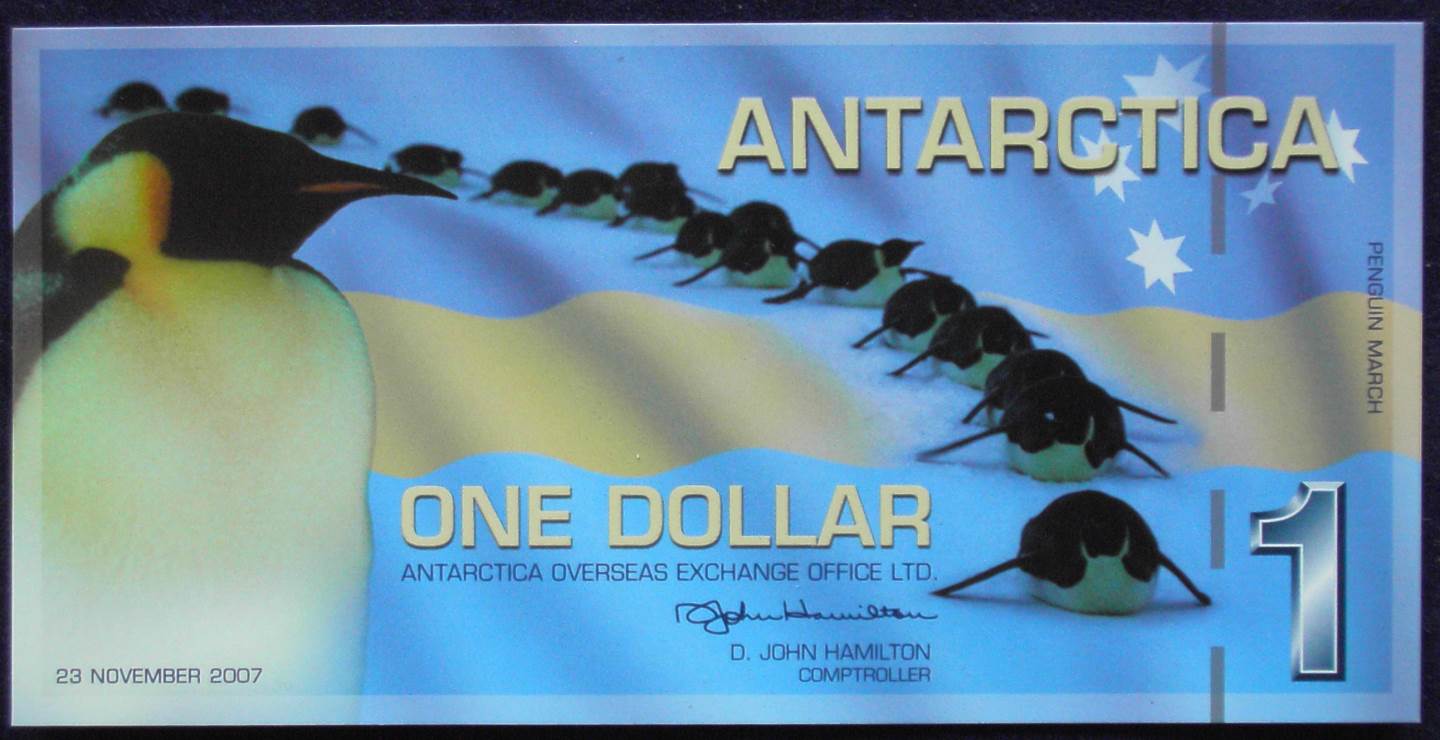 One of the more unusual banknotes to surface in recent times has been the advent of various formats of notes issued from Antarctica Overseas Exchange Office Ltd which was founded originally by D.J. Hamilton. These banknotes are private issues that have been carefully thought through and printed in a thoroughly professional manner. The notes even include proper security features and are a delight to look at both from an artistic point of view as well as from the finely executed printing. There have been three series of notes so far issued by the Exchange. These were known as the 1996, 1999 and 2001 series. They were created to raise funds for Antartic conservation works. Throughout the entire series, which were originally issued in 1996, the notes have been adorned with local themes which have been carefully selected to promote and boost interest in the collectibles marketplace. Twenty percent of the profits forthcoming from the sale of the notes is used to defray the costs incurred by the exchange. A massive 80% is distributed to organisations which seek to undertake research and humanitarian projects within the Antarctic region.