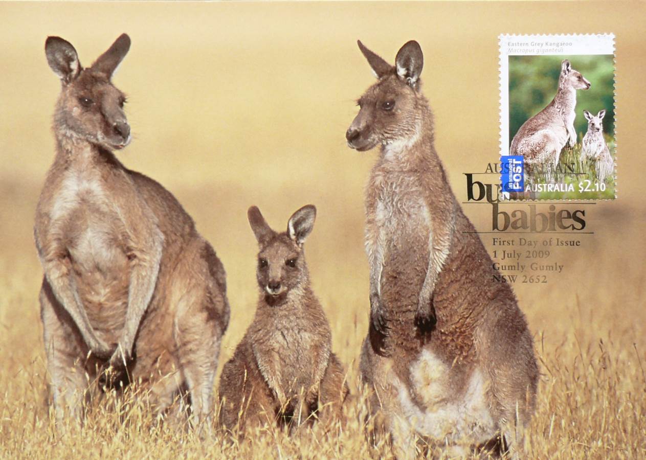 A kangaroo’s baby is refered to as a Joey. On this card depicting Australian native fauna released by Australia Post we get another lovely bush image of a kangaroo family. When kangaroos are together in greater numbers they are refered to as, ‘a mob’. There are 4 cards in this series with each one depicting a different native wildlife baby and its parent. They all have been postmarked for the first day of release at Gumly Gumly in New South Wales. on 1st July 2009.