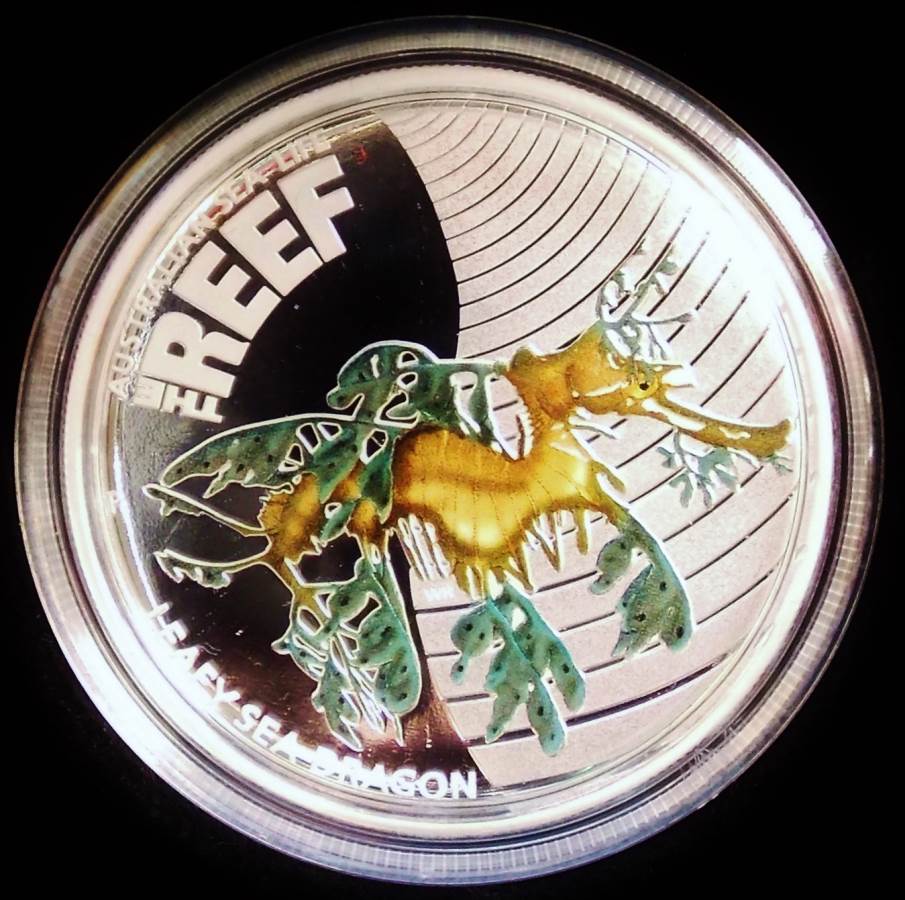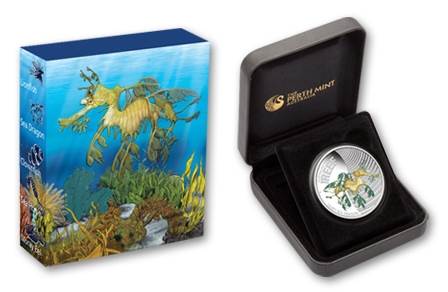 On the reverse of this coin a Leafy Sea Dragon in colour is portrayed.  The curious leaf like appendages are for camouflage and these uniquely Australian creatures are amongst the strangest found in Australian southern coastal waters.  The breeding habits are also quite unique as the female develops her eggs, the male then takes over the parenting and performs the rest of the incubation under his own tail. These coins have been hugely successful among all levels of collectors. The coin’s reverse also incorporates The Perth Mint’s historic ‘P’ mintmark.  Each coin is comes in a presentation case which comes in a colourfully illustrated box and is accompanied by a numbered Certificate of Authenticity.