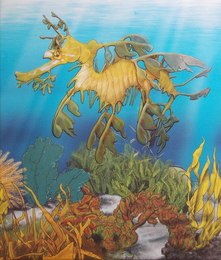The leafy seadragon or Glauert’s seadragon, Phycodurus eques, is a marine fish in the family Syngnathidae, which also includes the seahorses. It is the only member of the genus Phycodurus. It is found along the southern and western coasts of Australia.The name is derived from the appearance, with long leaf-like protrusions coming from all over the body. These protrusions are not used for propulsion; they serve only as camouflage. The leafy seadragon propels itself by means of a pectoral fin on the ridge of its neck and a dorsal fin on its back closer to the tail end. These small fins are almost completely transparent and difficult to see as they undulate minutely to move the creature sedately through the water, completing the illusion of floating seaweed. Popularly known as “leafies”, it is the marine emblem of the state of South Australia and a focus for local marine conservation.