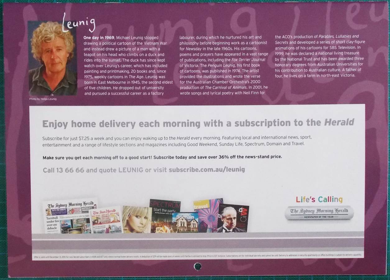 This 2010 calendar from Sydney Morning Herald featuring the cartoons of Australia’s legendary Michael Leunig is now on offer.
