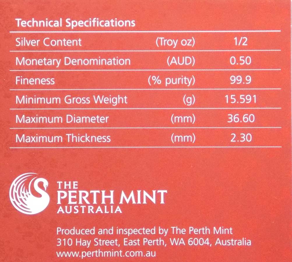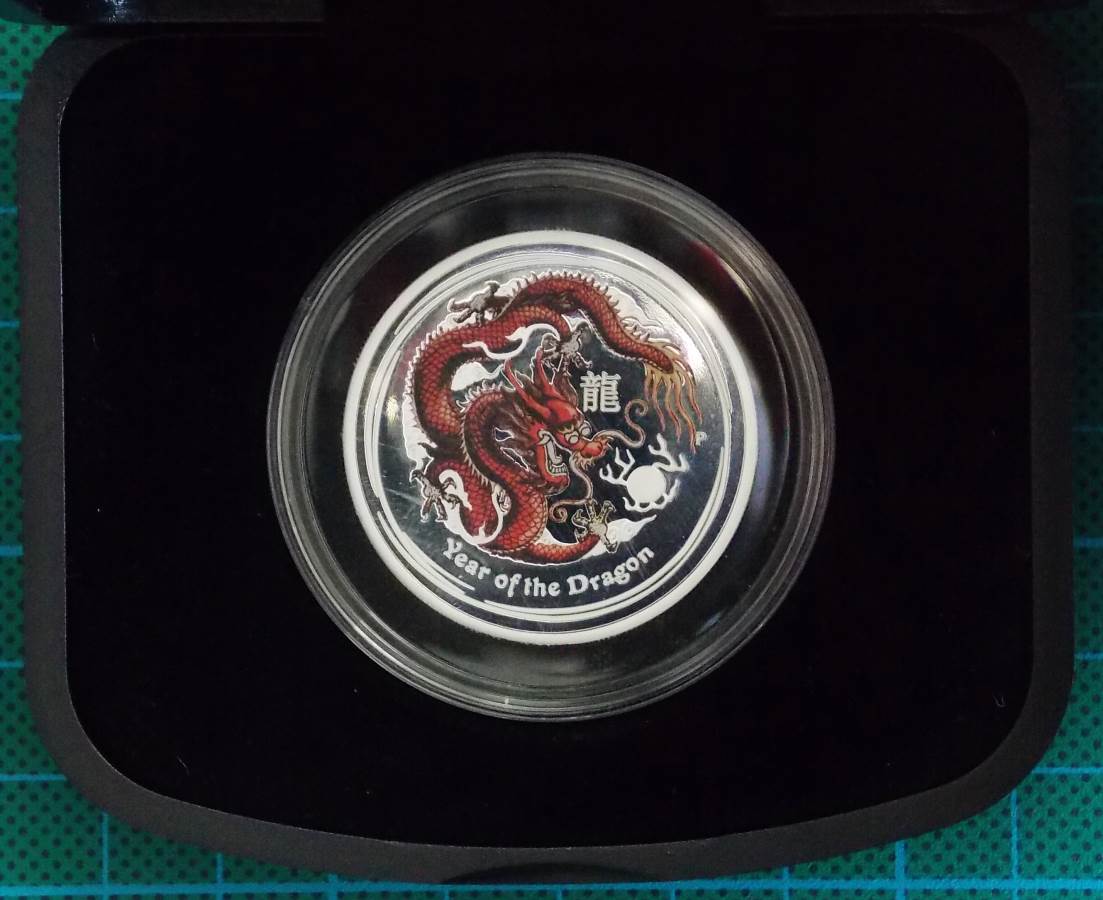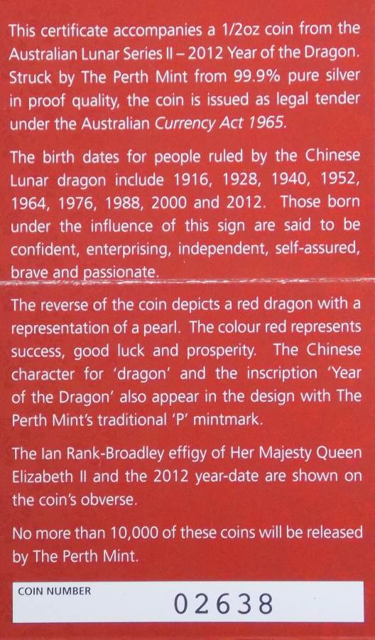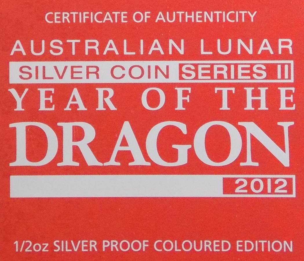 Minted as a celebration of the highly auspicious “Year of the Dragon”, this 1/2 oz 50 cents silver proof coloured coin from the Australian Lunar Silver Coins Series II are a limited offering from award winning Perth Mint.  This is the small version of the popular one ounce series. It offers the same fantastic design but at a far smaller price than the full one ounce coin.