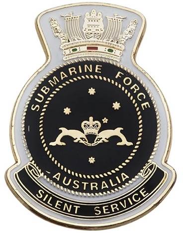 The replica lapel pin badge design features the dolphin and crown emblem and bears the inscription SUBMARINE FORCE AUSTRALIA SILENT SERVICE. Australian sailors in the Submarine Service are awarded a badge depicting two dolphins and a crown. This badge which is also known as a sailor’s ‘dolphins’ was originally  introduced in 1964 or there about and was then later adopted by the Royal Navy Submarine Service in 1972.