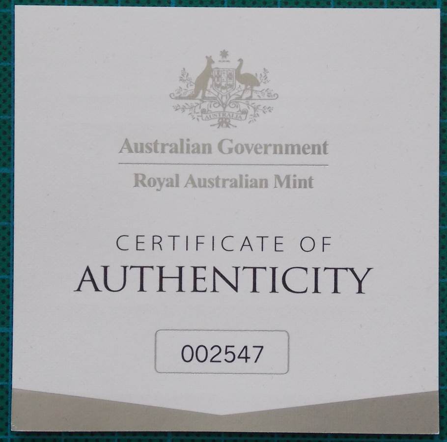 Comes with a numbered Certificate of Authenticity and original packaging with a Royal Australian Mint clam style case. Certificate number may vary from that shown.