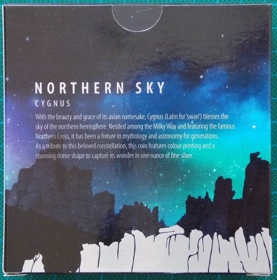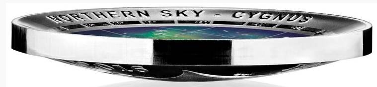 Reverse:   The reverse design of the coin is color printed on a concave surface, which provides a fabulous display of the Cygnus constellation framed within a compass designed border, as seen from the northern hemisphere against a background of blue and green. Designed by B. King.
