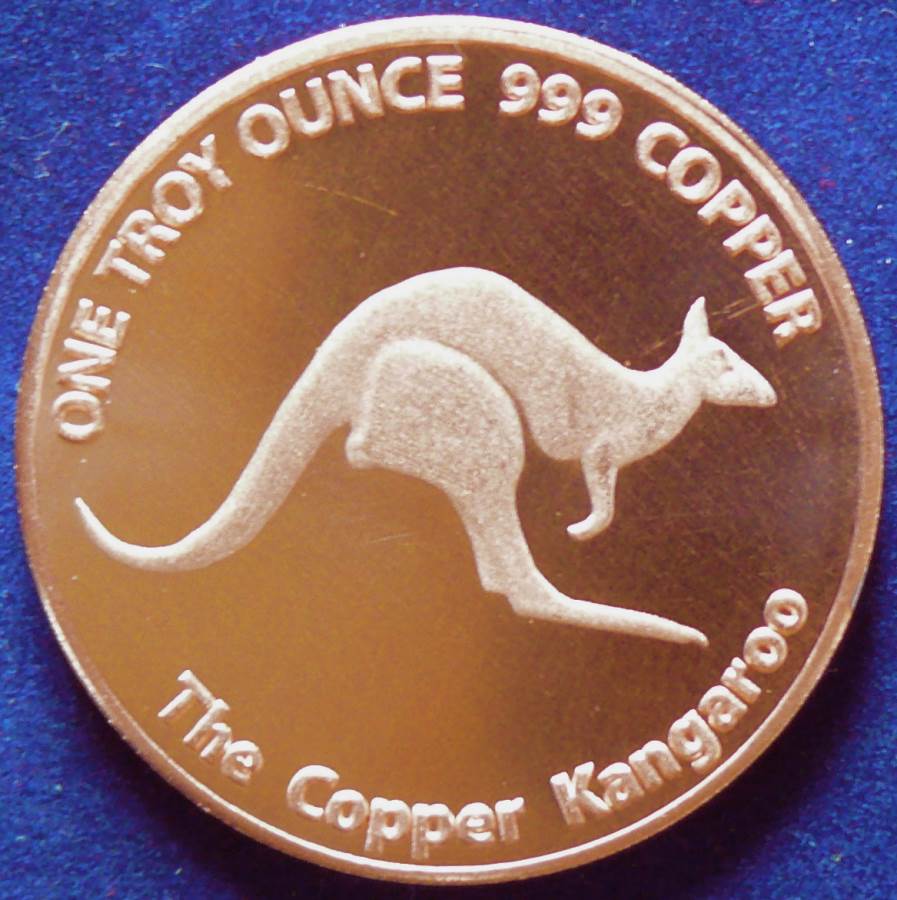 Stamped text is:AUSTRALIA 2009ONE TROY OUNCE 999 COPPER – THE COPPER KANGAROO